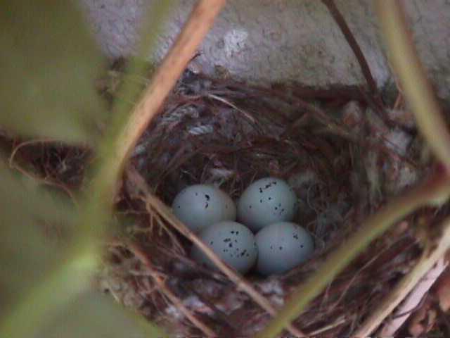 By now, I'm sure the expectant mother bird is getting very nervous, so I quickly take a closeup of the eggs in the nest, then get outa there....